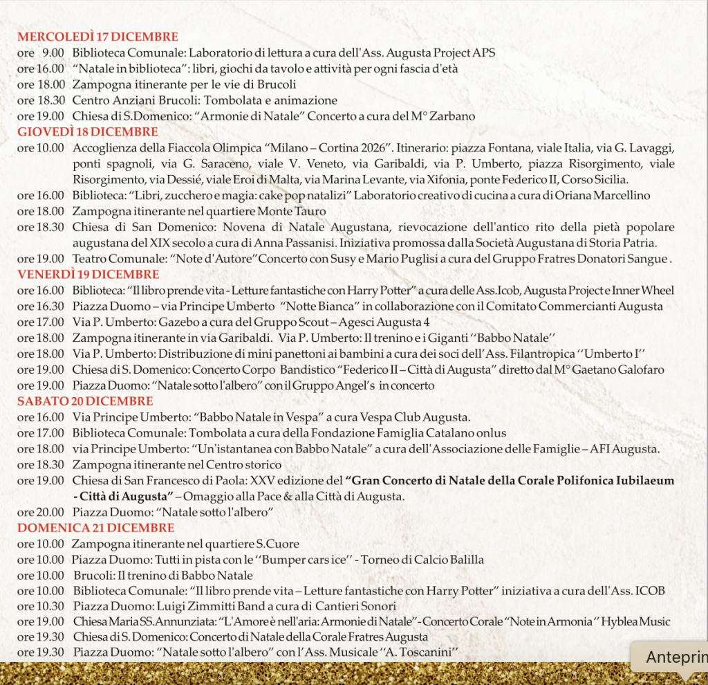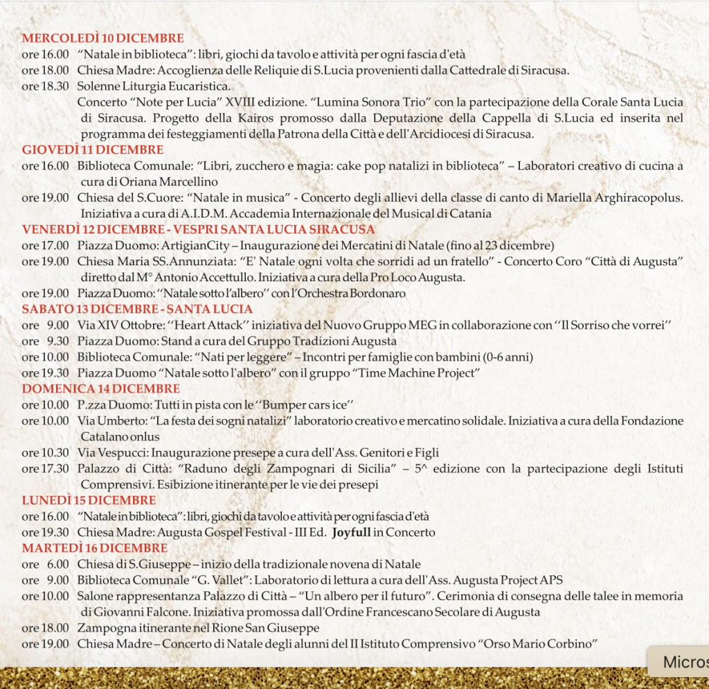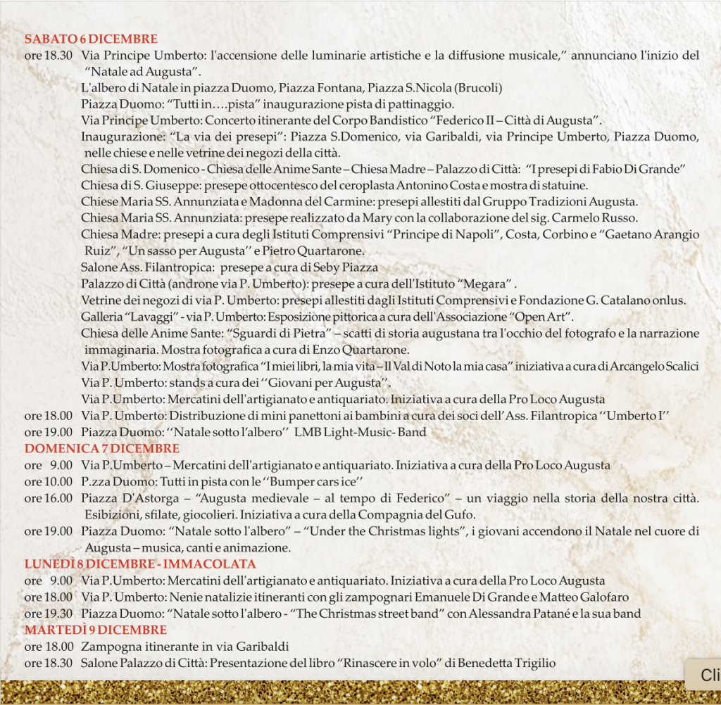 ore 18.00         via Principe Umberto: “Un’istantanea con Babbo Natale” a cura dell’Associazione delle Famiglie – AFI Augusta.