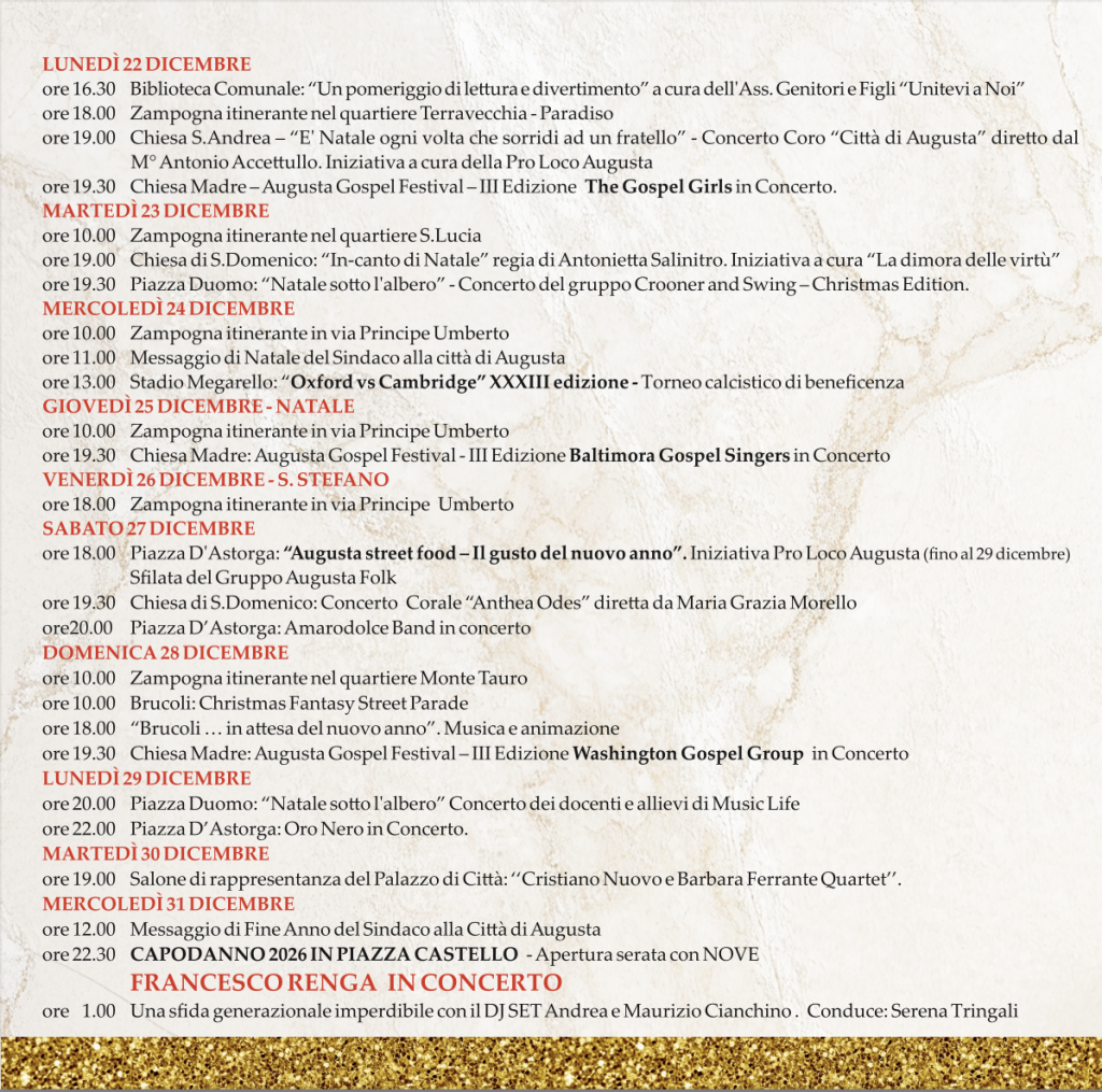 ore 19.00         Chiesa di San Francesco di Paola: XXV edizione del “Gran Concerto di Natale della Corale Polifonica Iubilaeum – Città di Augusta” – Omaggio alla Pace & alla Città di Augusta.