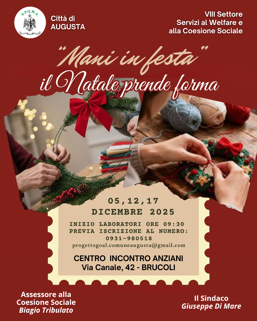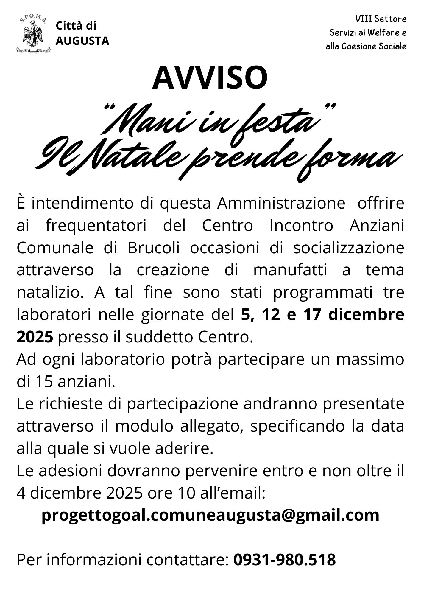 Pubblicato il: 27 Novembre 2025 “MANI IN FESTA” IL NATALE PRENDE FORMA HomeAvvisi“MANI IN FESTA” IL NATALE PRENDE FORMA Laboratori creativi natalizi avvisoDownload Modulo di adesioneDownload